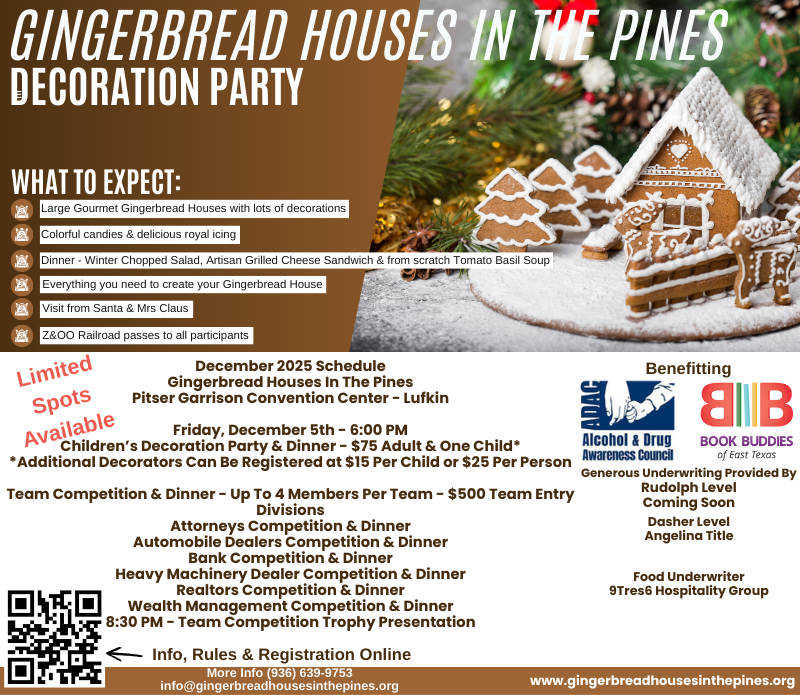The 1st Annual Gingerbread Houses In the Pines Team Competition will take place at 6:00 PM on Friday, December 5th, 2025. There are 6 categories: attorneys, automobile dealers, banks, heavy machinery dealers & wealth management. Each team will have one hour and 30 minutes to build their masterpiece. Judges will award the winner in each category with a trophy. The cost is $500 per team and up to 4 participants can be on each team. If any organization wants to have over 4 participants, they are welcome to add an additional team.